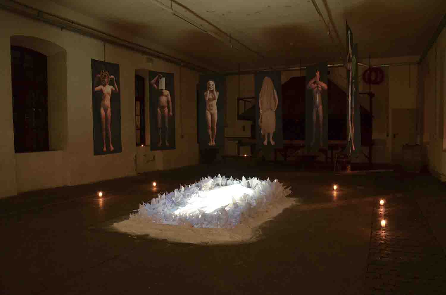 Comic book paper, newspaper, Japan Resist dyeing paper, packaging rope, tape, threads/ 59” x 31.5” x 63”/ 2010